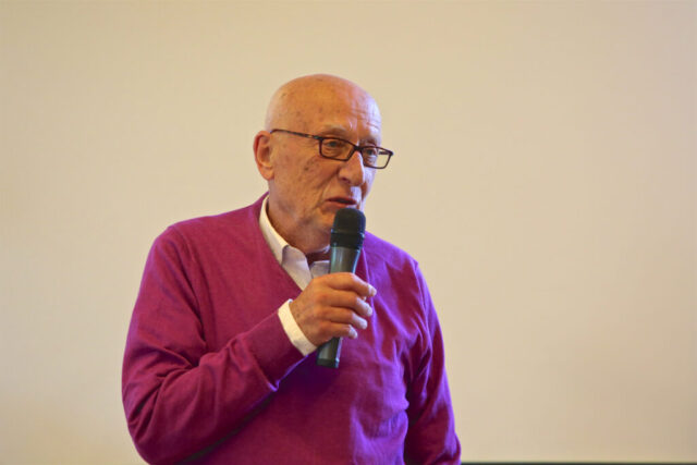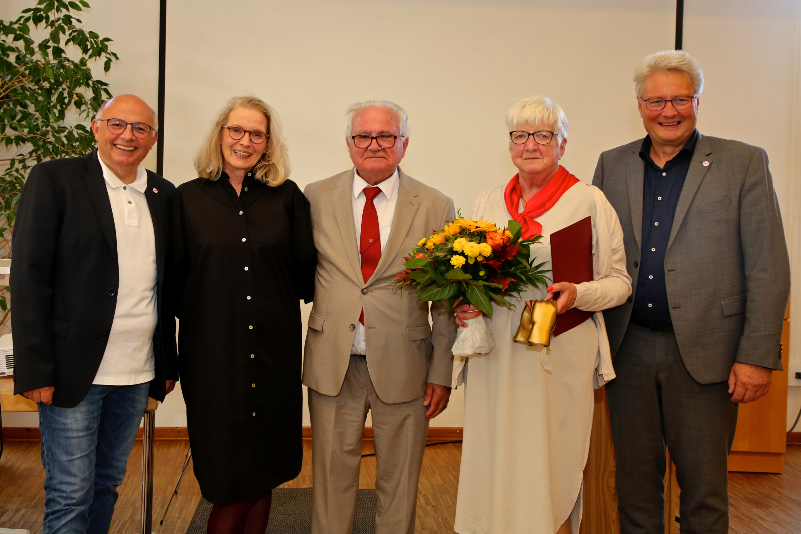 Laudator Dirk Swinke mit den Preistträger*innen Gerda Kühne, Evelyn Kumpf-Wilke, Christa Stutzki, Wolfgang Stutzki und Orga-Team-Sprecherin Regina Fiore