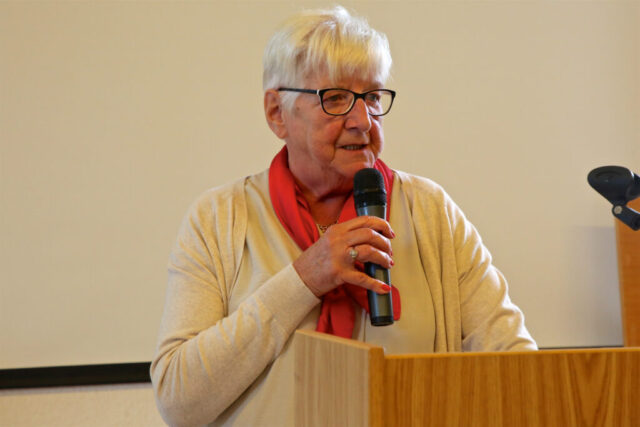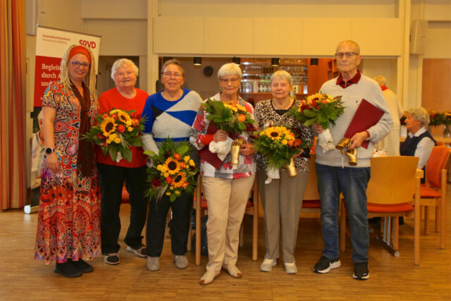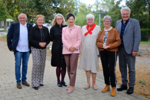 Laudatorin Santina Bartsch mit den Preisträger*innen Ingrid Kowitz, Rosemarie Arnold, Hannelore Schmitt, Rosemarie Hochstädt und Fred Köhn